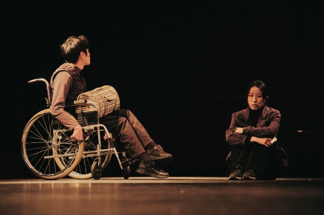No End, Only Silence is a disaster narrative and a fable devoid of any lesson. With the world on the brink of destruction, two individuals in wheelchairs, Fil and Van, along with their dog, are unable to board an evacuating spaceship and are thus left behind. As they face an uncertain future, a parallel narrative unfolds aboard the spaceship. Onboard, a boy and a girl, who concealed their scars to gain entry, are unable to find seats. As they wait for the impending, yet unknown, end of the world, they talk about “the future that came first,” while those those who wander talk about “the repeating past.” Sohee Youn invites the audience to contemplate an unendurable future where time, unlike in capitalism, holds no value and beginnings and endings are uncertain.