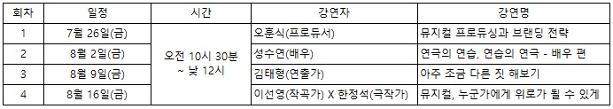 - 일정: 2019년 7월 26일, 8월 2일, 9일, 16일 (총 4회)
