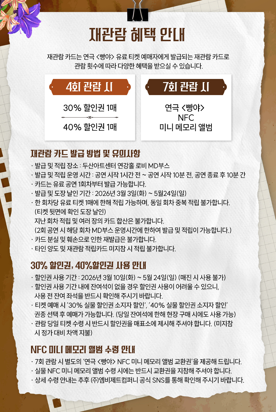 - 예매 티켓 수령 및 현장 구매는 공연 시작 1시간 전부터 가능합니다.