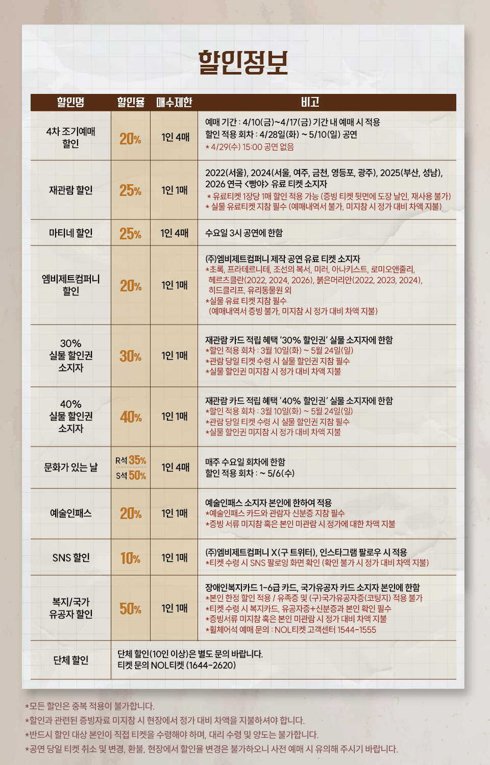 - 할인 증빙 자료 미지참 시 정가 대비 차액을 지불해 주셔야 티켓 수령이 가능합니다.