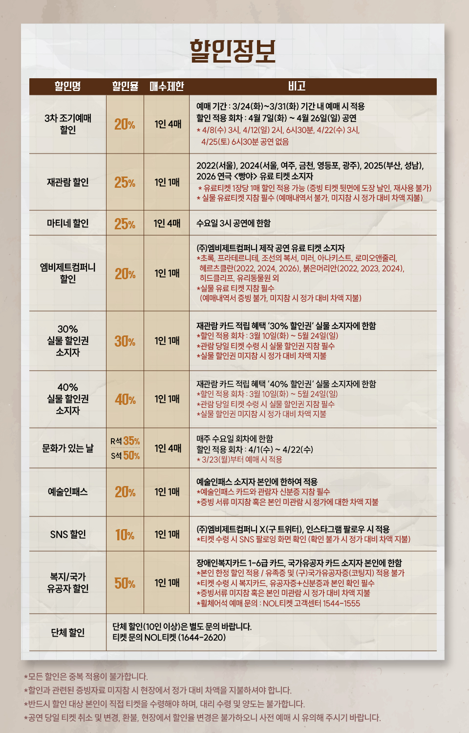 - 할인 증빙 자료 미지참 시 정가 대비 차액을 지불해 주셔야 티켓 수령이 가능합니다.